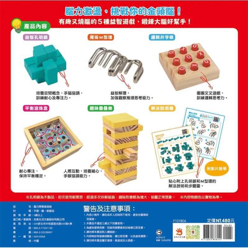 腦力全開!挑戰你的金頭腦! 有趣又燒腦的5種益智遊戲, 孔明鎖xM型環x井字棋x滾珠盒x疊疊樂 玩出聰明小腦袋! 一盒玩具,五種益智遊戲,玩出超強邏輯思維力! ★【益智孔明鎖】培養空間概念,手腦協調,訓練耐心及專注力 ★【魔術M型環】益智解環,加強觀察推理思考能力 ★【邏輯井字棋】圈圈叉叉遊戲,訓練邏輯思考力 ★【平衡滾珠盒】耐心專注,保持平衡穩定 ★【趣味疊疊樂】人際互動,培養細心、手眼協調能力 貼心附上孔明鎖和M型環解法說明和步驟圖, 掃描解法說明上的QR-Code,還有詳細影片說明喔! 本書特色 ★手腦協調x耐心專注x空間概念x觀察推理x挫折忍受x親子同樂 ★從組合與拆解中,加強手腦協調力! ★具挑戰性的玩法,訓練耐心及專注力! ★立體的益智玩具,從小培養空間概念! ★燒腦的遊戲方式,訓練觀察力與邏輯推理能力! ★過程須不斷嘗試,耐玩性高,同時培養挫折忍受能力! ★邏輯井字棋、趣味疊疊樂,大家一起互動,讓遊戲更好玩!