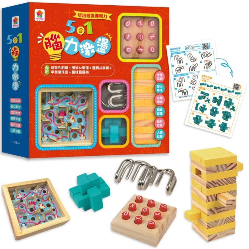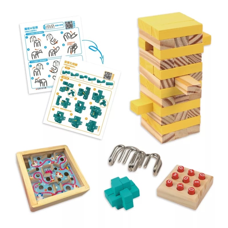 5合1腦力激盪:玩出最強邏輯力(內含1組趣味疊疊樂+1組益智孔明鎖+1個邏輯井字棋+1個魔術M型環+1個平衡滾珠盒+1張解法說明)