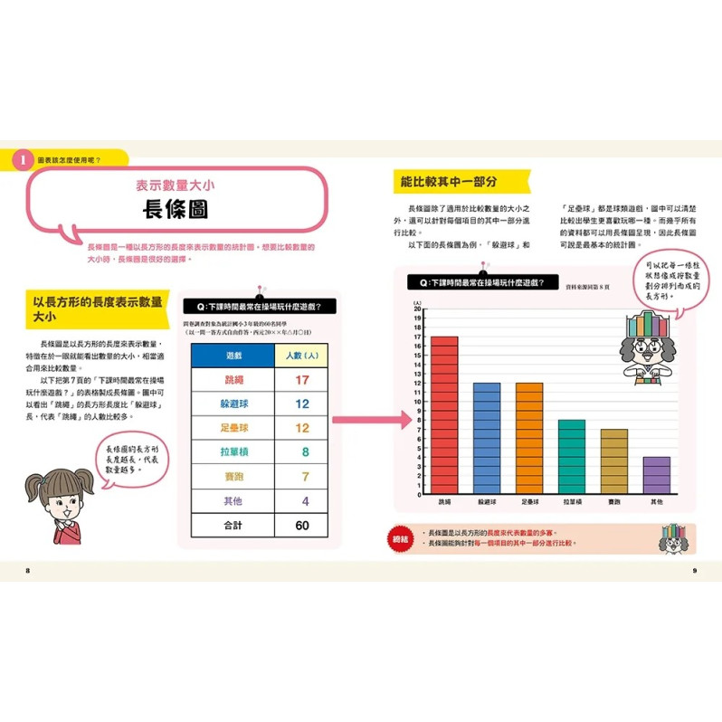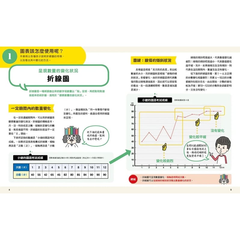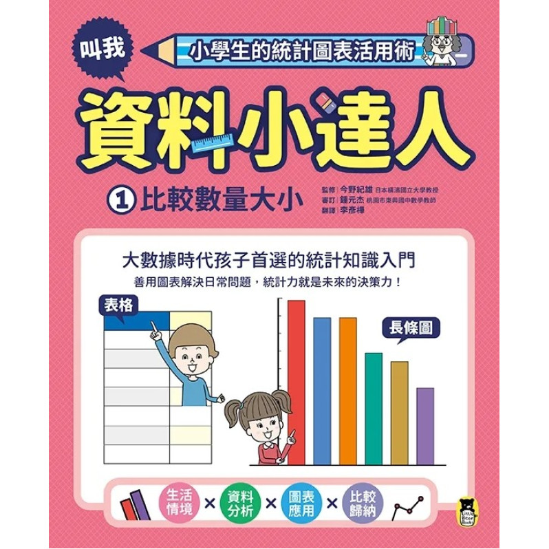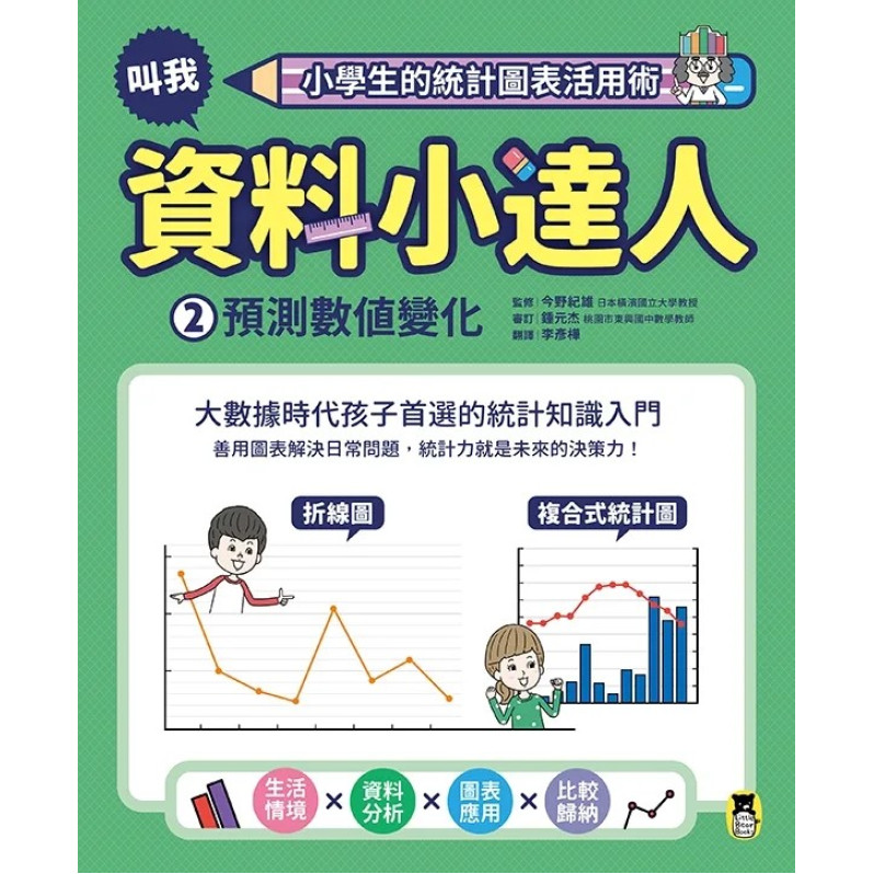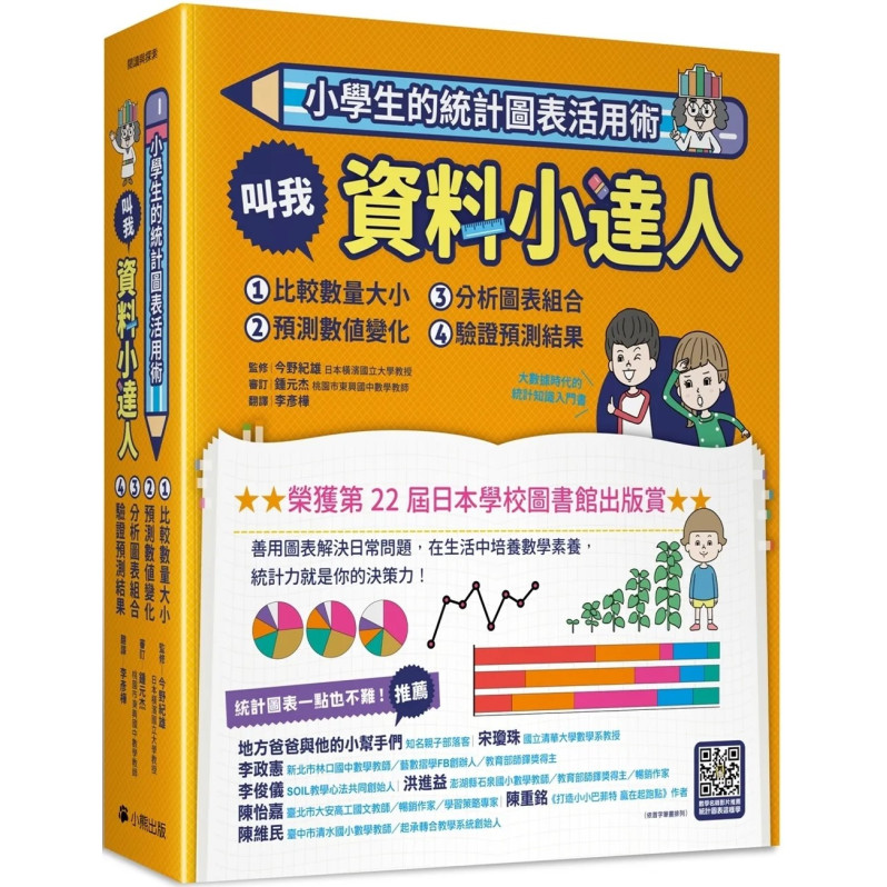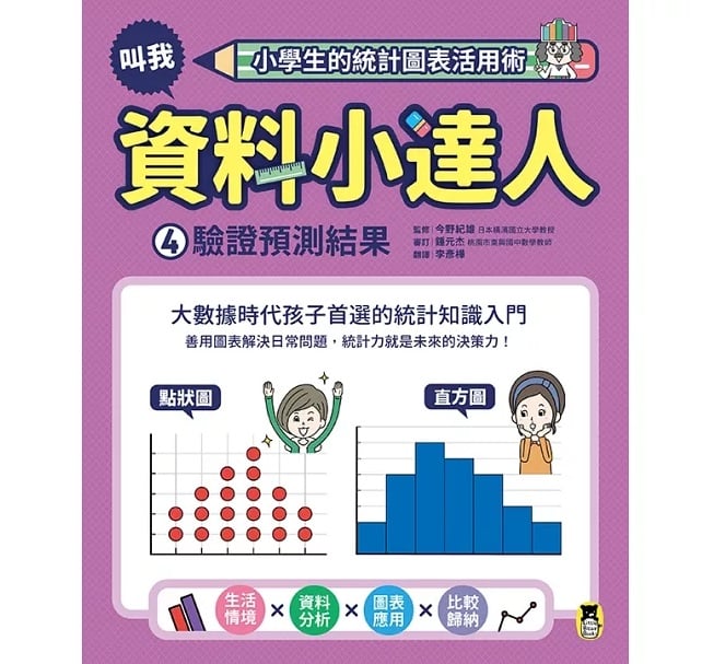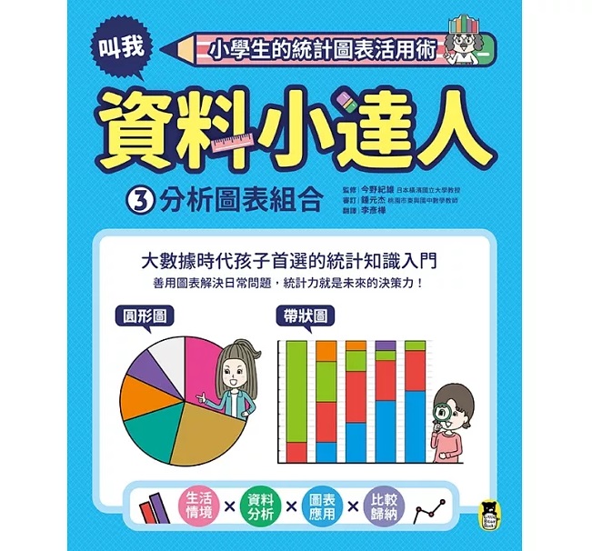 【生活情境×資料分析×圖表應用×比較歸納】 大數據時代孩子首選的統計知識入門 善用圖表解決日常問題, 統計力就是未來的決策力! ★清晰圖示+淺白解析+趣味情境=統計圖表一點就通! ★介紹從小學三年級到中學一年級會出現的各式圖表,學習綜合多種圖表作出適當的判讀,並熟悉資料分析的邏輯與技巧。 ★學習運用「PPDAC循環」,將蒐集到的資料整理為統計圖表,解決生活中可能實際遇到的問題。 ★將自然、社會等跨領域科目帶入統計圖表,並鼓勵孩子主動探索實際的數據,扣合108課綱素養教育精神。 「統計」似乎抽象又無聊,就連大人都不一定熟悉,為什麼108課綱規定孩子從小學三年級開始就要接觸統計呢? 這是因為「統計」並不只是單純的數學概念,更是「資料處理」的重要工具。在這個資訊爆炸的時代,每個人都必須具備基礎的統計概念,才能在龐雜的數據之海中,獲得自己真正需要的資訊。 而在蒐集資料以後,要如何將其整理得令人一目了然,那就是「統計圖表」登場的時候了! 生活中處處都可以見到統計圖表的蹤影,從氣象預報常見中的雨量長條圖、氣溫折線圖,到電玩遊戲中顯示角色能力的雷達圖,你不一定要精通統計,但絕對必須學會判讀統計圖表! 「小學生的統計圖表活用術」是一套專為小學生打造的統計知識繪本,除了運用大量圖表幫助理解統計概念,還融入生活化情境,為孩子培養數學素養。 當孩子跟著書中虛構的「統計國小」學生,使用統計調查循環「PPDAC」,解決生活中的大小問題時,可以深刻感受到,統計不是沒有溫度的抽象數值,而是生活中隨處可以派上用場的實際工具。 除此之外,本套書還透過真實數據,探討實際存在的科學現象與社會議題,除了讓孩子理解統計廣泛的應用範圍,更為孩子建立跨越多重領域的學科知識連結。 快翻開這套書,跟著統計國小的學生一步步奠定統計知識,成為「資料小達人」吧! ●《小學生的統計圖表活用術:叫我資料小達人1.比較數量大小》 重點圖表:表格、長條圖(群組長條圖、堆疊長條圖) 本書以基礎的「比較數量」為主題,介紹「表格」、「長條圖」兩種能夠整理數據,並且清晰呈現數量多寡,以便進行比較的統計圖表。引導孩子探討生活中各種情境下的數值大小、數據高低、數量多寡等問題,進而針對不同狀況作出適當的判讀。 並以貼近孩子日常生活的問題──「一起決定營養午餐」為例,代入統計調查方法「PPDAC循環」的五個步驟,引導孩子學習先建立假說、預測結論,再蒐集資料加以驗證的研究方法,解決問卷調查過程中,或者解讀問卷調查結果時可能遇到的問題,培養數學素養。 最後根據真實數據,探討「向日葵的成長過程」、「動物的睡眠時間」、「小學生的隨身物品重量」、「臺灣人口最多的縣市」以及「調查水果產地」等五個在臺灣和世界各地實際存在的現象與問題,與社會、自然等科目做連結,使孩子得以進行跨領域的學習。 ●《小學生的統計圖表活用術:叫我資料小達人2.預測數值變化》 重點圖表:折線圖、複合式統計圖 本書介紹可以清晰呈現數值變化的「折線圖」,以及結合長條圖與折線圖的「複合式統計圖」,引導孩子探討生活中各種情境下的數值變化、增減幅度、變化趨勢等問題,進而針對不同狀況作出適當的判讀與趨勢預測。 並以貼近孩子日常生活的問題──「商品放置位置會影響銷售量嗎?」為例,代入統計調查方法「PPDAC循環」的五個步驟,引導孩子靈活運用多種圖表進行分析,解決商業活動中可能遇到的問題,培養數學素養。 最後根據真實數據,探討「哪種顏色比較容易升溫」、「交通事故死傷人數的變化」、「造訪臺灣的外國旅客人數是否增加」、「預測職棒觀賽民眾人數變化」與「恆春與屏東的最高溫變化」等五個在臺灣和世界各地實際存在的現象與問題,與社會、自然等科目做連結,使孩子得以進行跨領域的學習。 ●《小學生的統計圖表活用術:叫我資料小達人3.分析圖表組合》 重點圖表:圓形圖、帶狀圖 本書介紹「圓形圖」、「帶狀圖」兩種以呈現比例分布為目的的統計圖表,除了引入「比例」概念,也透過豐富圖解,詳述圓形圖與帶狀圖之間的差異與特色,和在使用上應該注意的事項。 並以貼近孩子日常生活的問題──「如何決定運動大會比賽項目?」為例,代入統計調查方法「PPDAC循環」的五個步驟,引導孩子靈活運用多種圖表進行分析,解決生活中可能出現的難題,培養數學素養。 最後根據真實數據,探討「臺北的氣候類型」、「日本的垃圾量變化」、「鹹海受破壞的環境問題」以及「發電能源比例」等四個在臺灣和世界各地實際存在的現象與問題,與社會、自然等科目做連結,使孩子得以進行跨領域的學習。 ●《小學生的統計圖表活用術:叫我資料小達人4.驗證預測結果》 重點圖表:點狀圖(散布圖)、直方圖 重點概念:代表值(平均數、中位數、眾數) 本書介紹「點狀圖」、「直方圖」兩種呈現數據分布狀況的統計圖表,並帶入「代表值」概念,幫助孩子使用平均數、中位數與眾數來掌握分散數據的特徵。 並以貼近孩子日常生活的問題──「如何提升運動鞋的銷售量?」為例,代入統計調查方法「PPDAC循環」的五個步驟,引導孩子學習先建立假說、預測結論,再蒐集資料加以驗證的研究方法,解決商業活動中可能遇到的問題,培養數學素養。 最