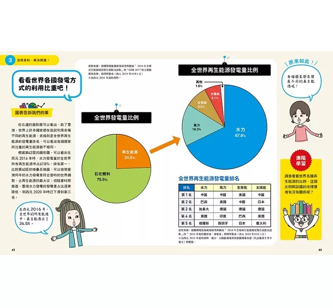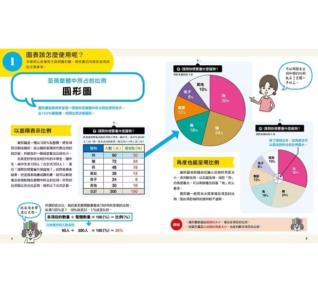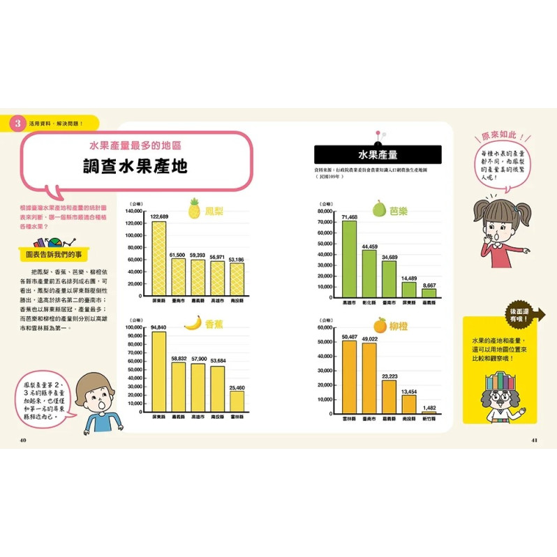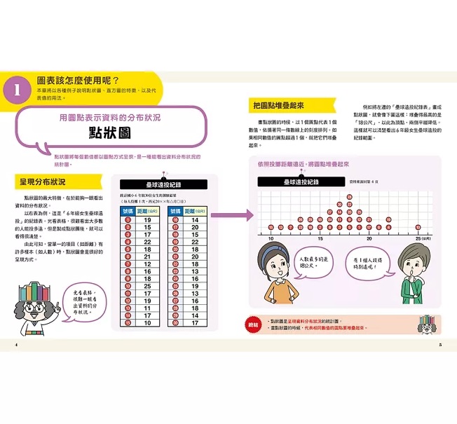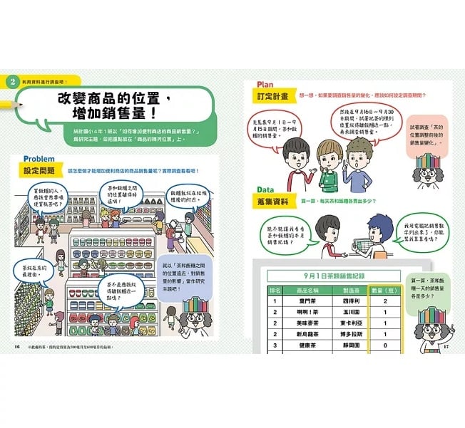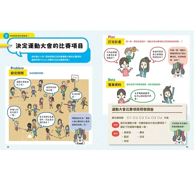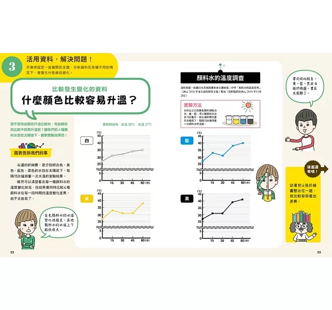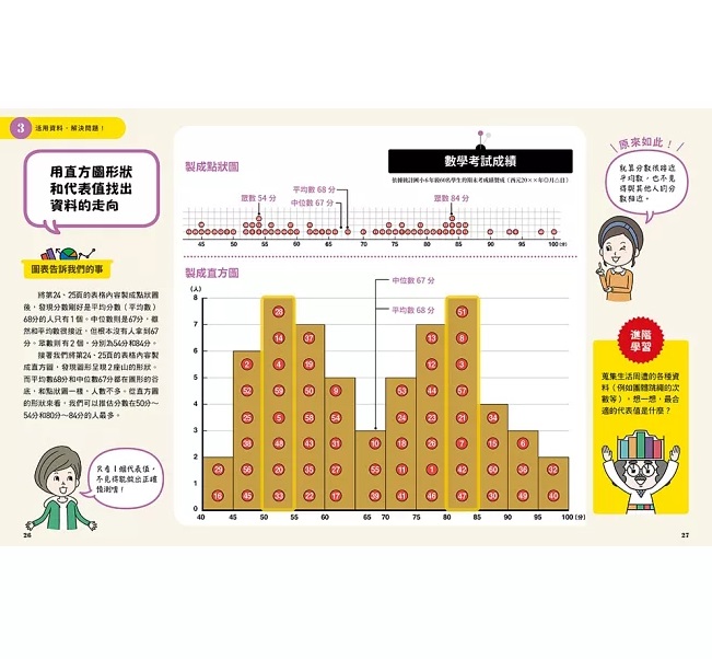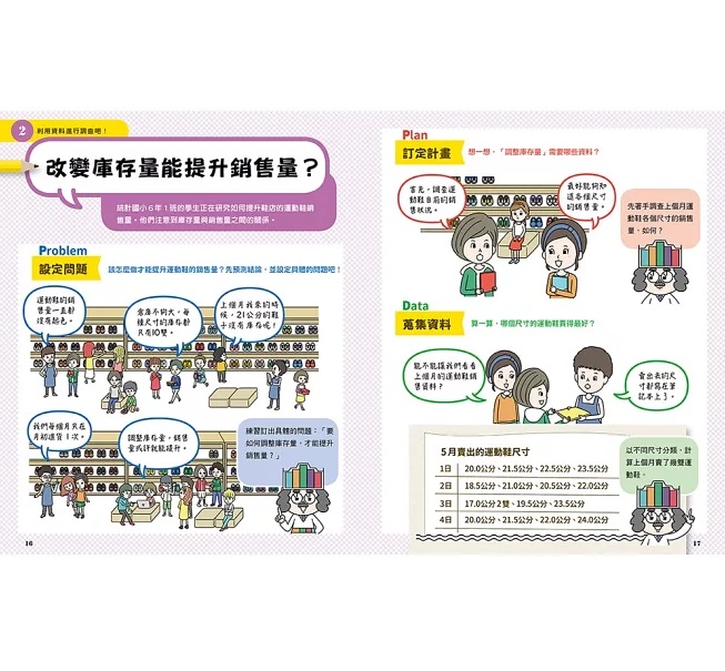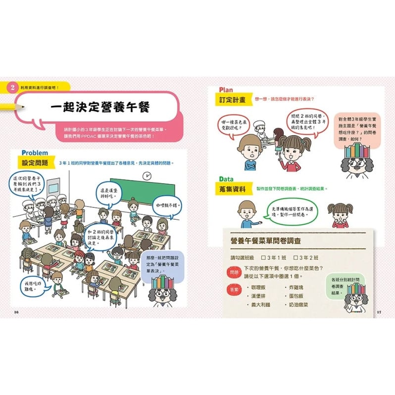 【生活情境×資料分析×圖表應用×比較歸納】 大數據時代孩子首選的統計知識入門 善用圖表解決日常問題, 統計力就是未來的決策力! ★清晰圖示+淺白解析+趣味情境=統計圖表一點就通! ★介紹從小學三年級到中學一年級會出現的各式圖表,學習綜合多種圖表作出適當的判讀,並熟悉資料分析的邏輯與技巧。 ★學習運用「PPDAC循環」,將蒐集到的資料整理為統計圖表,解決生活中可能實際遇到的問題。 ★將自然、社會等跨領域科目帶入統計圖表,並鼓勵孩子主動探索實際的數據,扣合108課綱素養教育精神。 「統計」似乎抽象又無聊,就連大人都不一定熟悉,為什麼108課綱規定孩子從小學三年級開始就要接觸統計呢? 這是因為「統計」並不只是單純的數學概念,更是「資料處理」的重要工具。在這個資訊爆炸的時代,每個人都必須具備基礎的統計概念,才能在龐雜的數據之海中,獲得自己真正需要的資訊。 而在蒐集資料以後,要如何將其整理得令人一目了然,那就是「統計圖表」登場的時候了! 生活中處處都可以見到統計圖表的蹤影,從氣象預報常見中的雨量長條圖、氣溫折線圖,到電玩遊戲中顯示角色能力的雷達圖,你不一定要精通統計,但絕對必須學會判讀統計圖表! 「小學生的統計圖表活用術」是一套專為小學生打造的統計知識繪本,除了運用大量圖表幫助理解統計概念,還融入生活化情境,為孩子培養數學素養。 當孩子跟著書中虛構的「統計國小」學生,使用統計調查循環「PPDAC」,解決生活中的大小問題時,可以深刻感受到,統計不是沒有溫度的抽象數值,而是生活中隨處可以派上用場的實際工具。 除此之外,本套書還透過真實數據,探討實際存在的科學現象與社會議題,除了讓孩子理解統計廣泛的應用範圍,更為孩子建立跨越多重領域的學科知識連結。 快翻開這套書,跟著統計國小的學生一步步奠定統計知識,成為「資料小達人」吧! ●《小學生的統計圖表活用術:叫我資料小達人1.比較數量大小》 重點圖表:表格、長條圖(群組長條圖、堆疊長條圖) 本書以基礎的「比較數量」為主題,介紹「表格」、「長條圖」兩種能夠整理數據,並且清晰呈現數量多寡,以便進行比較的統計圖表。引導孩子探討生活中各種情境下的數值大小、數據高低、數量多寡等問題,進而針對不同狀況作出適當的判讀。 並以貼近孩子日常生活的問題──「一起決定營養午餐」為例,代入統計調查方法「PPDAC循環」的五個步驟,引導孩子學習先建立假說、預測結論,再蒐集資料加以驗證的研究方法,解決問卷調查過程中,或者解讀問卷調查結果時可能遇到的問題,培養數學素養。 最後根據真實數據,探討「向日葵的成長過程」、「動物的睡眠時間」、「小學生的隨身物品重量」、「臺灣人口最多的縣市」以及「調查水果產地」等五個在臺灣和世界各地實際存在的現象與問題,與社會、自然等科目做連結,使孩子得以進行跨領域的學習。 ●《小學生的統計圖表活用術:叫我資料小達人2.預測數值變化》 重點圖表:折線圖、複合式統計圖 本書介紹可以清晰呈現數值變化的「折線圖」,以及結合長條圖與折線圖的「複合式統計圖」,引導孩子探討生活中各種情境下的數值變化、增減幅度、變化趨勢等問題,進而針對不同狀況作出適當的判讀與趨勢預測。 並以貼近孩子日常生活的問題──「商品放置位置會影響銷售量嗎?」為例,代入統計調查方法「PPDAC循環」的五個步驟,引導孩子靈活運用多種圖表進行分析,解決商業活動中可能遇到的問題,培養數學素養。 最後根據真實數據,探討「哪種顏色比較容易升溫」、「交通事故死傷人數的變化」、「造訪臺灣的外國旅客人數是否增加」、「預測職棒觀賽民眾人數變化」與「恆春與屏東的最高溫變化」等五個在臺灣和世界各地實際存在的現象與問題,與社會、自然等科目做連結,使孩子得以進行跨領域的學習。 ●《小學生的統計圖表活用術:叫我資料小達人3.分析圖表組合》 重點圖表:圓形圖、帶狀圖 本書介紹「圓形圖」、「帶狀圖」兩種以呈現比例分布為目的的統計圖表,除了引入「比例」概念,也透過豐富圖解,詳述圓形圖與帶狀圖之間的差異與特色,和在使用上應該注意的事項。 並以貼近孩子日常生活的問題──「如何決定運動大會比賽項目?」為例,代入統計調查方法「PPDAC循環」的五個步驟,引導孩子靈活運用多種圖表進行分析,解決生活中可能出現的難題,培養數學素養。 最後根據真實數據,探討「臺北的氣候類型」、「日本的垃圾量變化」、「鹹海受破壞的環境問題」以及「發電能源比例」等四個在臺灣和世界各地實際存在的現象與問題,與社會、自然等科目做連結,使孩子得以進行跨領域的學習。 ●《小學生的統計圖表活用術:叫我資料小達人4.驗證預測結果》 重點圖表:點狀圖(散布圖)、直方圖 重點概念:代表值(平均數、中位數、眾數) 本書介紹「點狀圖」、「直方圖」兩種呈現數據分布狀況的統計圖表,並帶入「代表值」概念,幫助孩子使用平均數、中位數與眾數來掌握分散數據的特徵。 並以貼近孩子日常生活的問題──「如何提升運動鞋的銷售量?」為例,代入統計調查方法「PPDAC循環」的五個步驟,引導孩子學習先建立假說、預測結論,再蒐集資料加以驗證的研究方法,解決商業活動中可能遇到的問題,培養數學素養。 最
